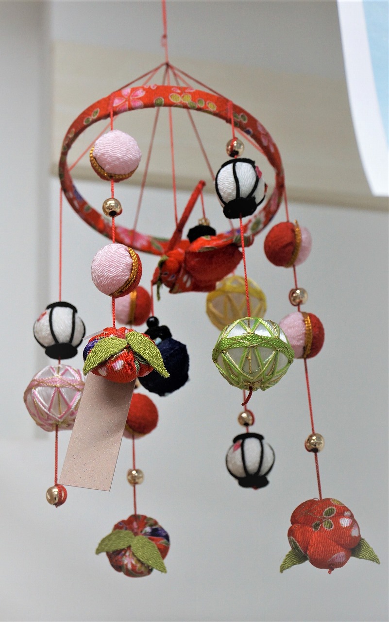四季折々の歳時記や、祈願など意味を持つパーツを縫ったり貼ったりしていくつも作り、ヒモにこれらを連ねて天井からつるすものになります。