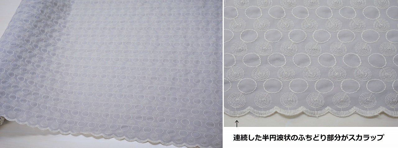 「スカラップ」とはホタテ貝の貝殻を並べたような連続した半円の波状のふちどりの事を指します。スカートやお洋服の裾に使うことでワンランクUPしたような作品になりますよ!!