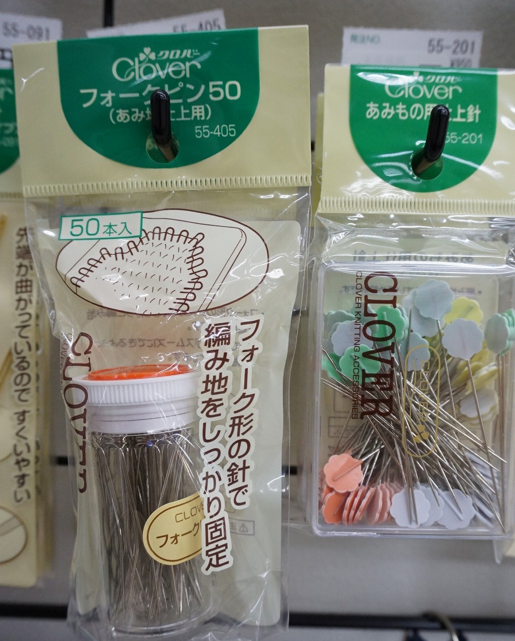 フォークピン50は、針軸が曲がったフォーク型のピン。2本の針で厚みのあるレース地を固定します。あみもの用仕上針は厚みのある編み地をしっかり固定してくれます。