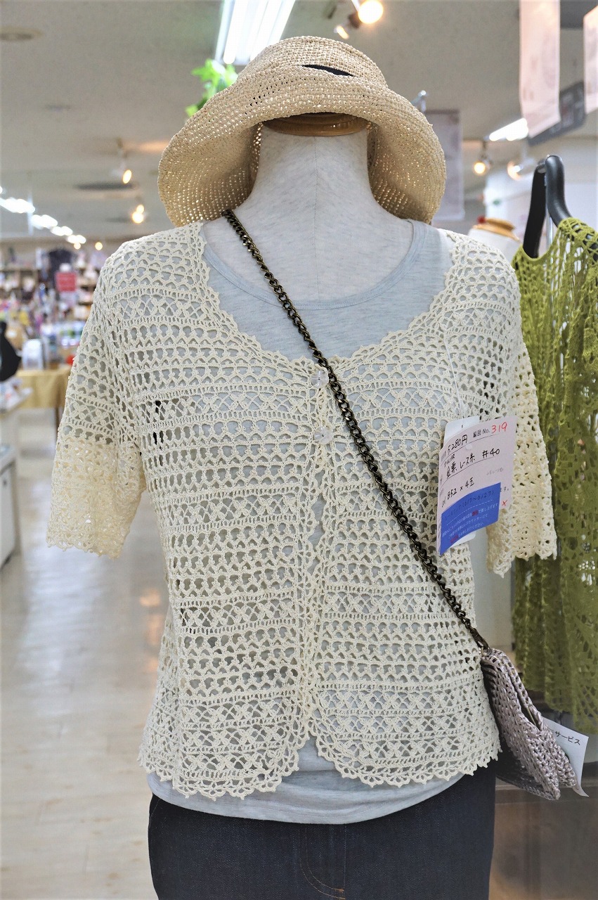 レース糸を使った見本は1玉から作れるものから、4玉で人気見本①②のようなボレロやえり付きベストをご製作頂くことができます!夏ですと金票シリーズがとても軽い素材感で涼しく着て頂けるので売場でも人気のデザインでございます。