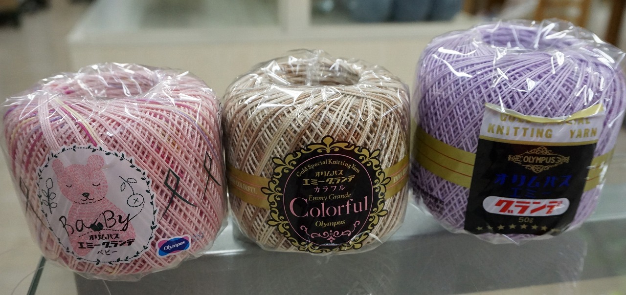 綿100%・国産のエミーグランデシリーズ。こちらも糸すべりが滑らかで、しなやかで光沢を感じて頂ける糸なので様々なレース編みにお使い頂けます。