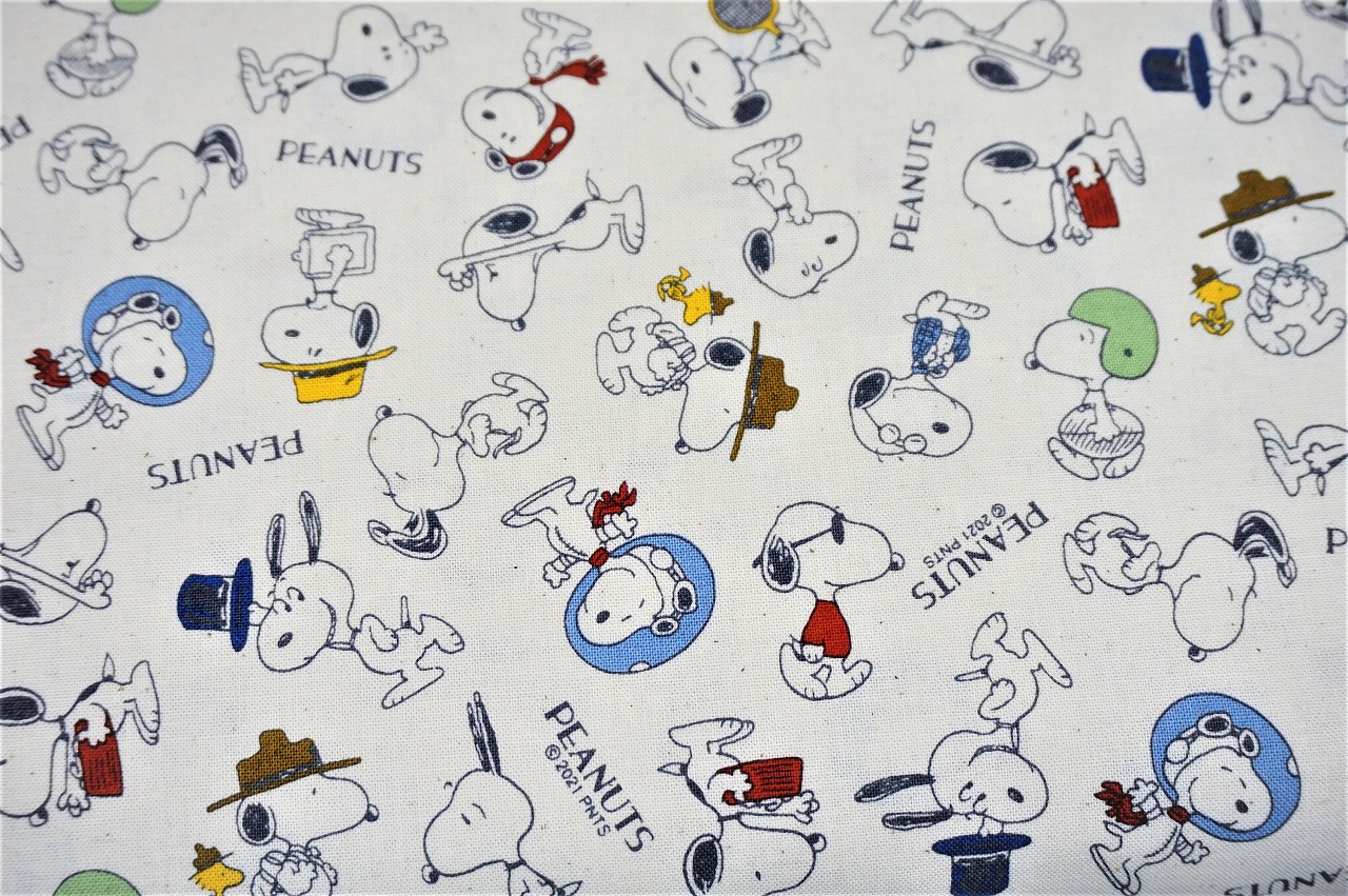 ピーナッツ柄が賑やかな手書きタッチの生地です。様々な表情・姿が可愛らしい柄です。抗菌防臭付きなのでインテリアグッズや小物、エプロンなどにおすすめです。
