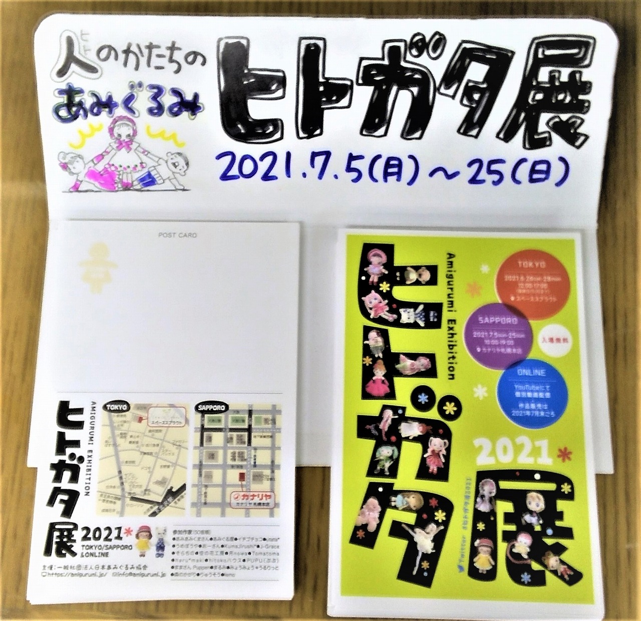 「ヒトガタ展2021」札幌会場はカナリヤ本店4階で7/25(日)まで開催致しております。DMハガキも会場内にあり、ハガキの裏には文字内に作品の写真がちりばめられて可愛いのです!
