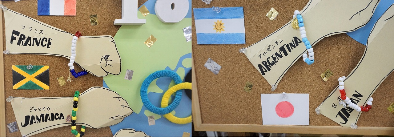 世界で応援しているような可愛いブレスレットのディスプレイが目に入りついつい見てしまいます♪ 今回はオリンピックをイメージしていますが、好きな色で組み合わせて作ってみてほしいので参考としてご覧ください。