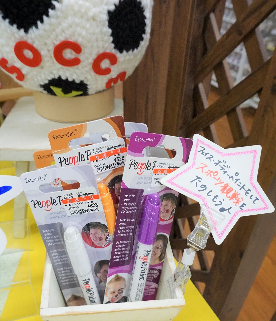 スポーツや学校祭の時に使えるフェイス・ボディペイントも販売中!顔や腕にペイントしておうちで観戦してみるのも良いですね。(後ろにはさりげなくサッカーボールのあみぐるみ♪)