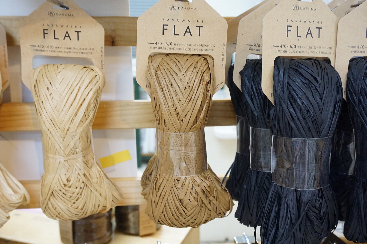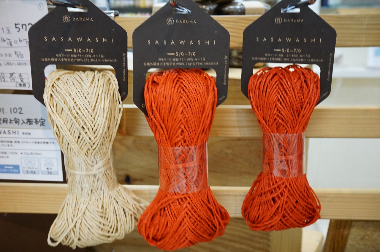 こちらは定番にあたるSASAWASHIですが、抗菌・防臭・UVカットが施され、水に濡らすと若干強度が弱りますが乾くと元にもどります。こちらも「くま笹」を使用した和紙を使用しているので、和紙ならではの光沢感、風合いを楽しんで頂ける糸になります。サマーハットやバッグ作りに◎