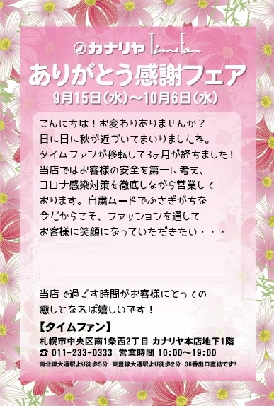 2021年9月15日(水)~10月6日(水)までの期間、タイムファンでは「ありがとう感謝フェア」を開催致します。