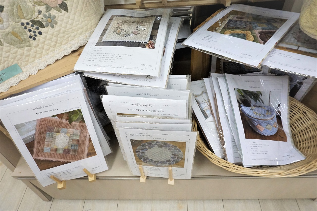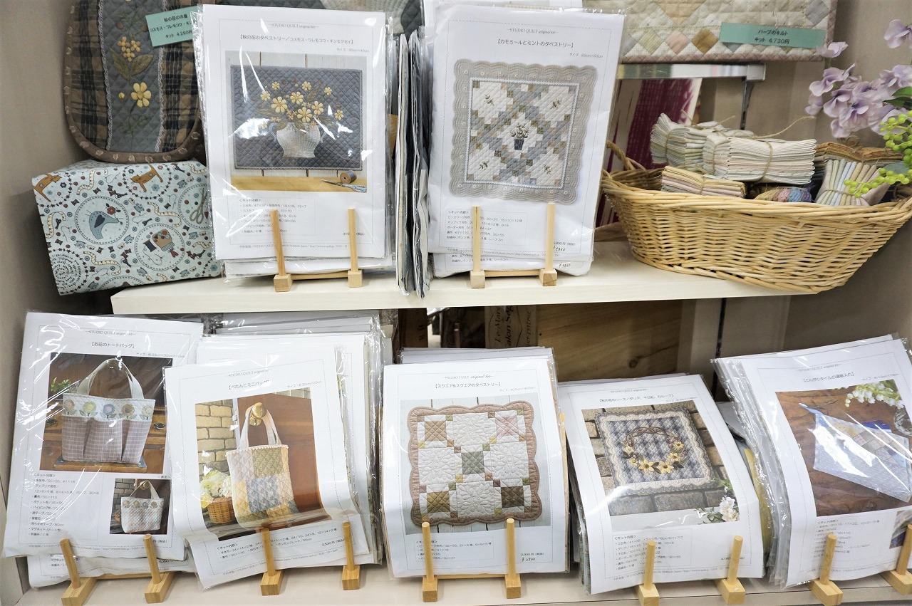北欧風のお花に落ち着いた色合いの、見るだけで癒される素敵なパッチワークキルト作品の見本とそのキットが沢山展示致しております。