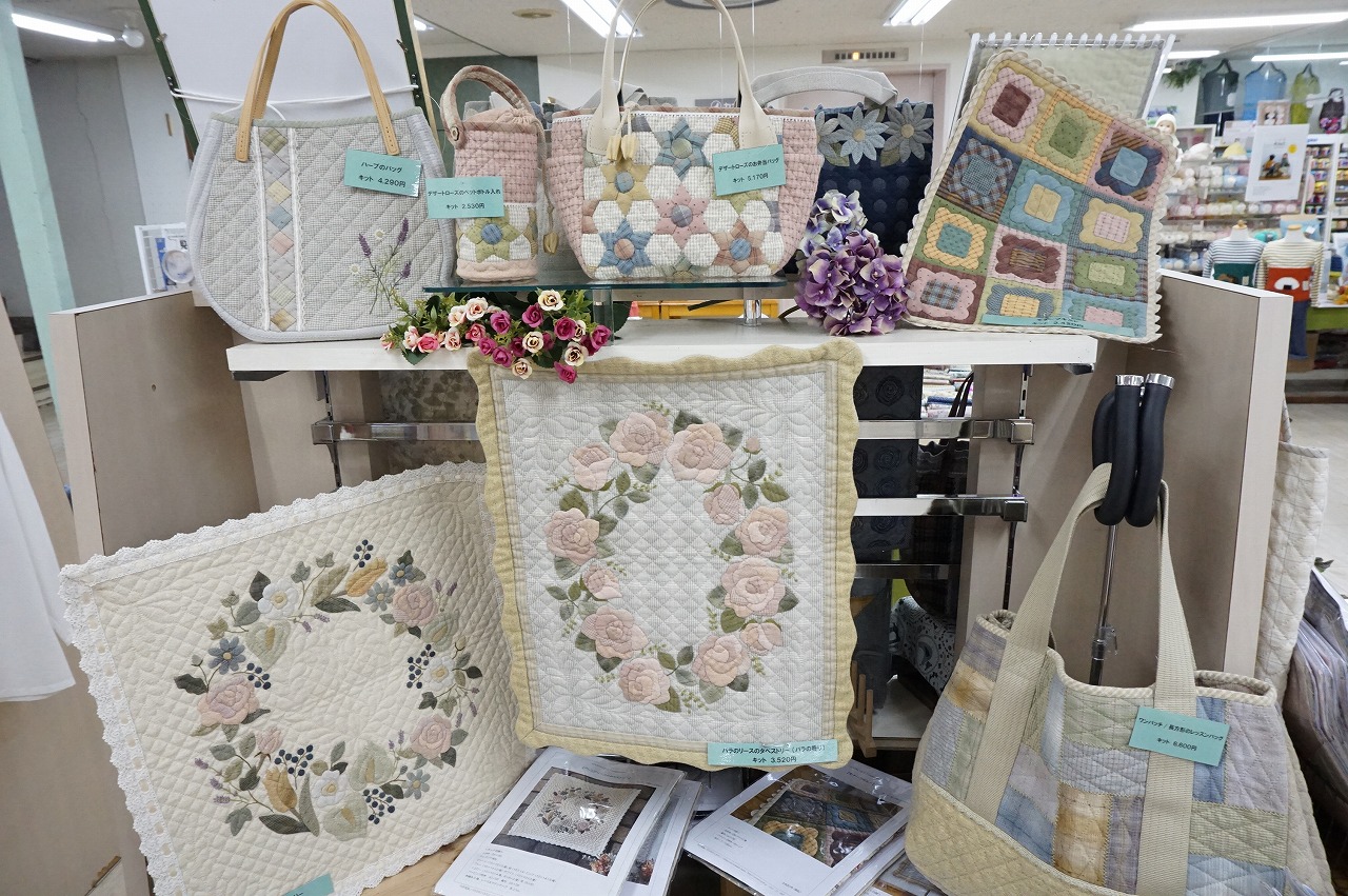 バッグ、タペストリー、ポーチ等を中心とした見本作品が豊富です!どの作品もお花は可愛らしく、季節感を感じさせる優しい色あいが揃っているので作りごたえあるものばかり!