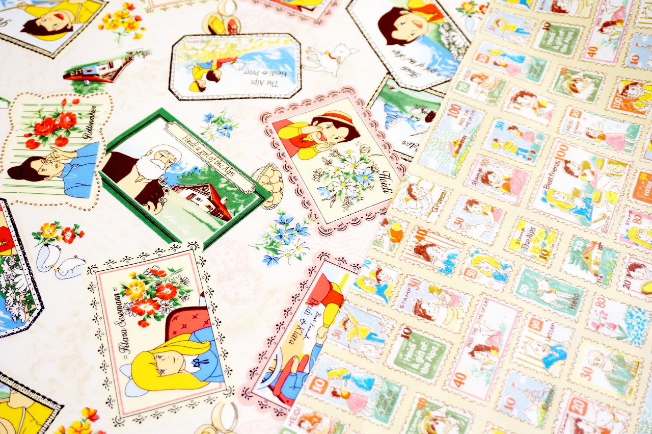 こちらは切手やフォトフレームにキャラクターがぎっしり詰まったカラフルなラミネート生地2種です♪ハイジ、クララ、おじいさん等勢揃いしています。