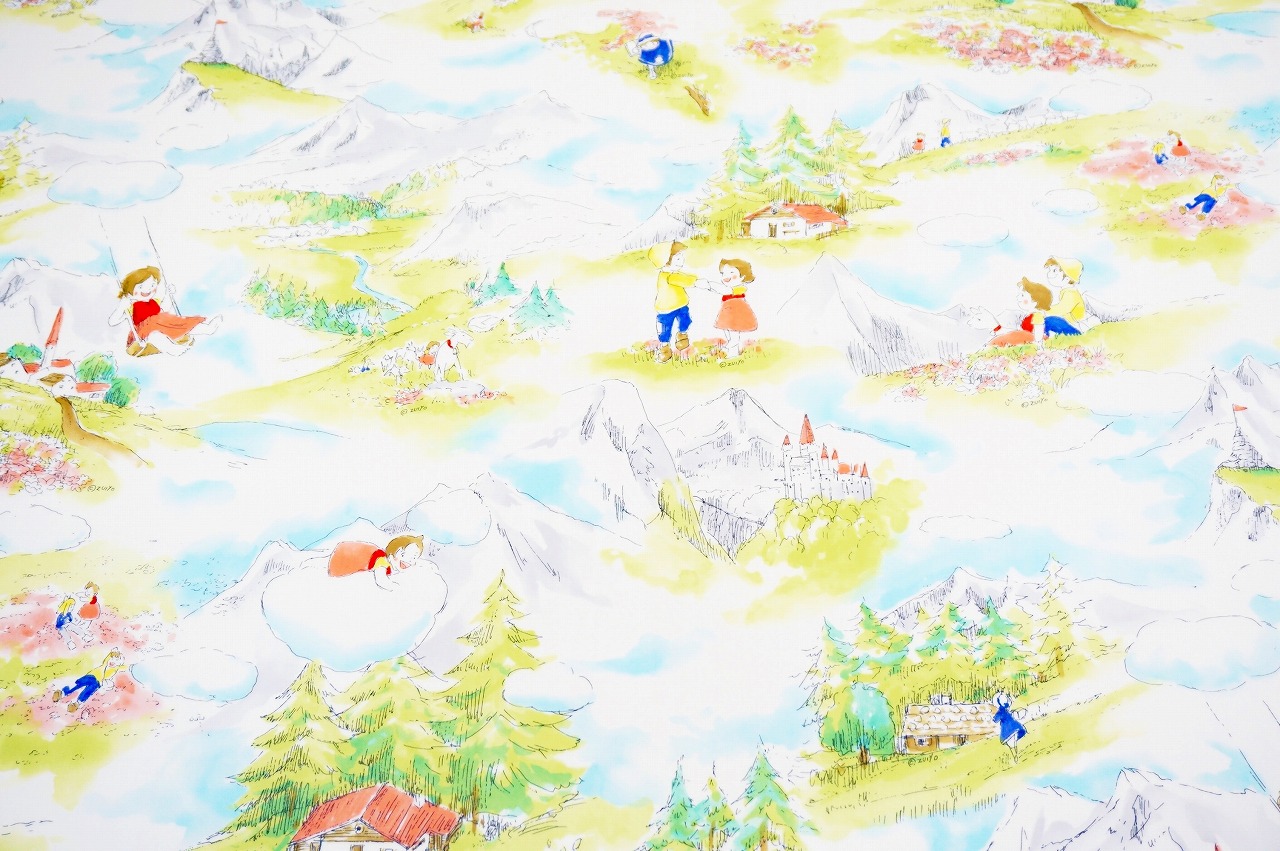 ハイジラミネート生地より、ハイジの世界観を感じて頂けるパステル調のラミネート生地です。ハイジがブランコに乗ったシーンやペーターと遊ぶシーン等が可愛いです。