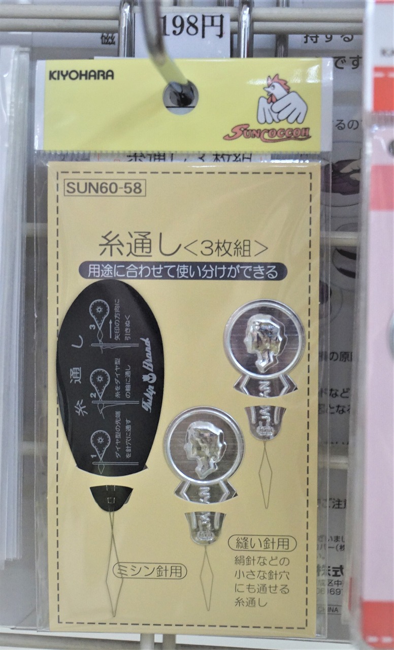 糸通しは紹介されたアイテムとは少し違いますが、針に糸を通せない時のお助けアイテムはこちら↓