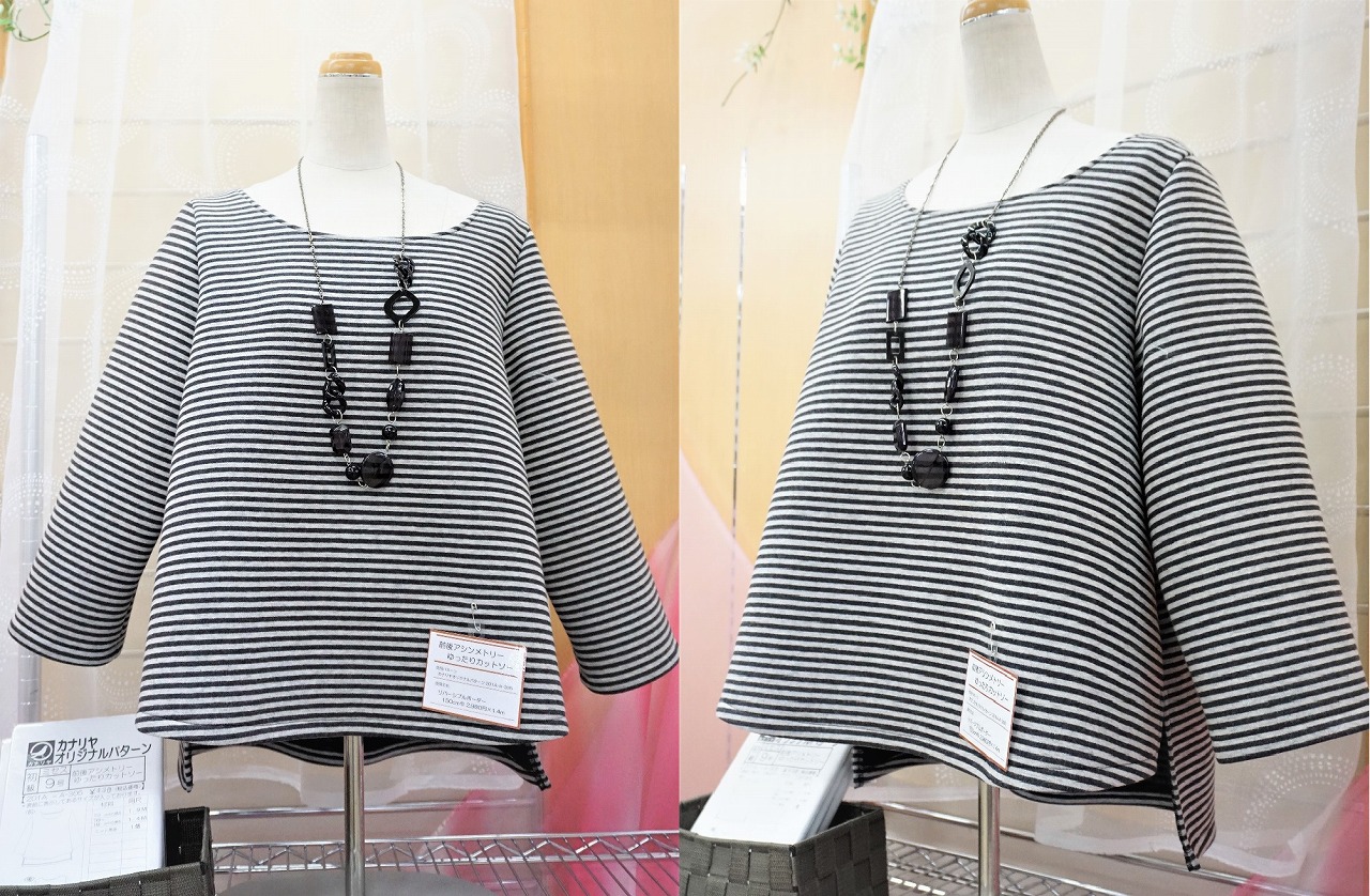 前後アシンメトリーゆったりカットソーは袖つけが直線でかんたんに縫う事が出来ます!普段着から外出時におすすめです。ハリのある生地を使えばおしゃれ着に、ニット素材を使えばカジュアルに着て頂けます。前身頃が短く、後ろは長めで着こなしやすいデザインです。
