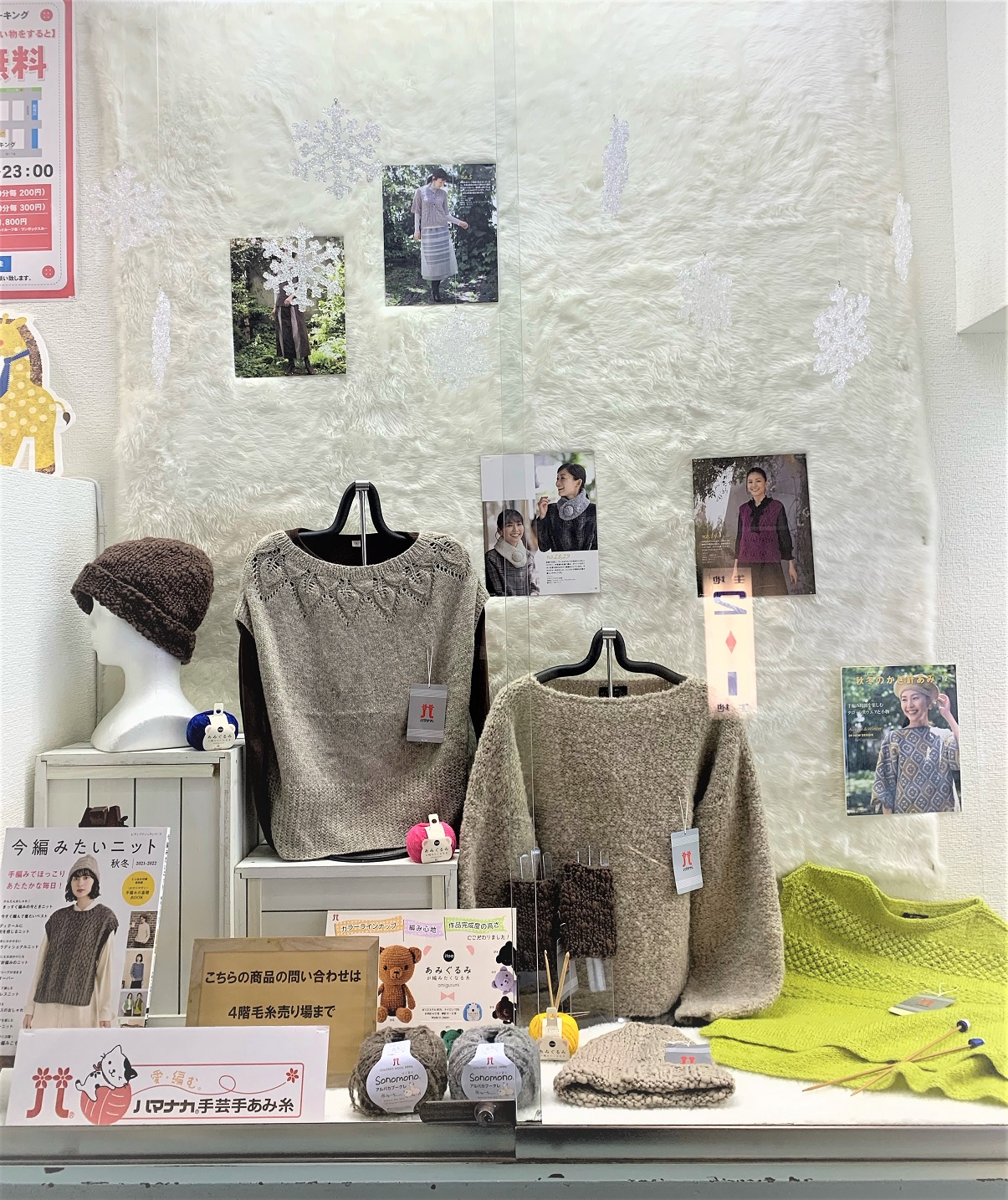 カナリヤ本店南口中ウィンド―でも毛糸を使ったセーターや帽子、アームウォーマー等の見本を展示中!