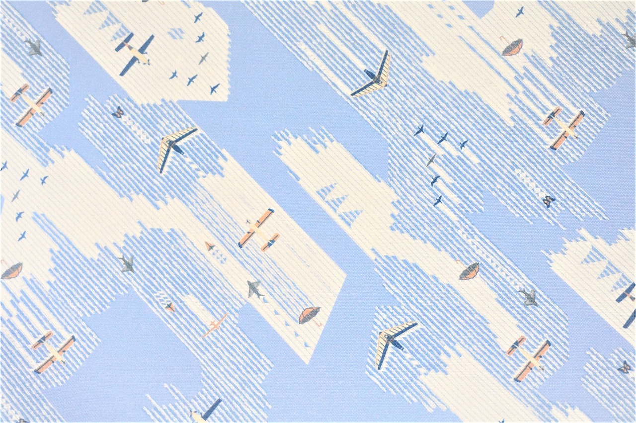 飛行機・傘・トビウオ等が空を飛んでいる様子が描かれています。広大な空をイメージさせる明るい柄なので飛行機や空が好きな方におすすめです。