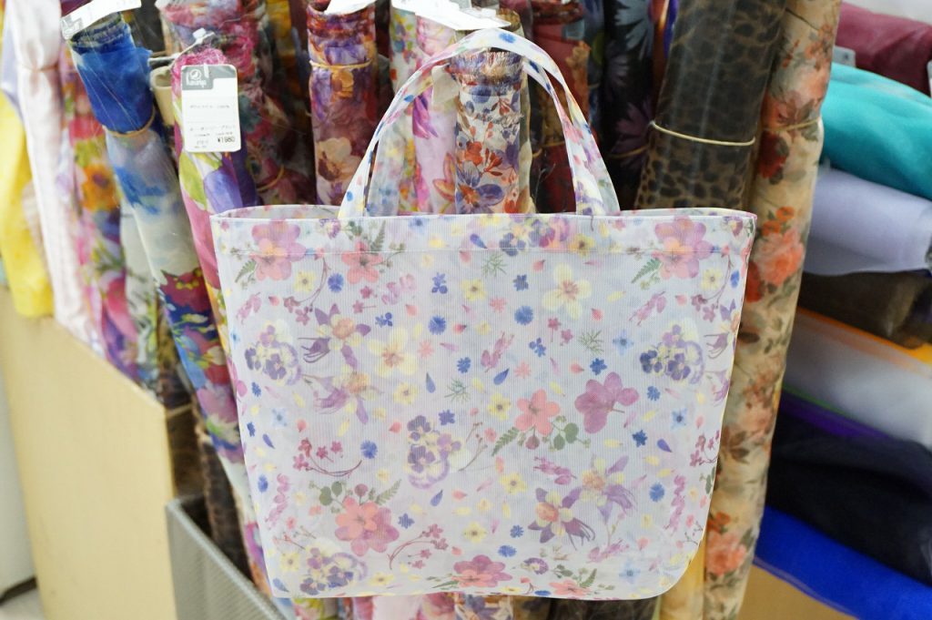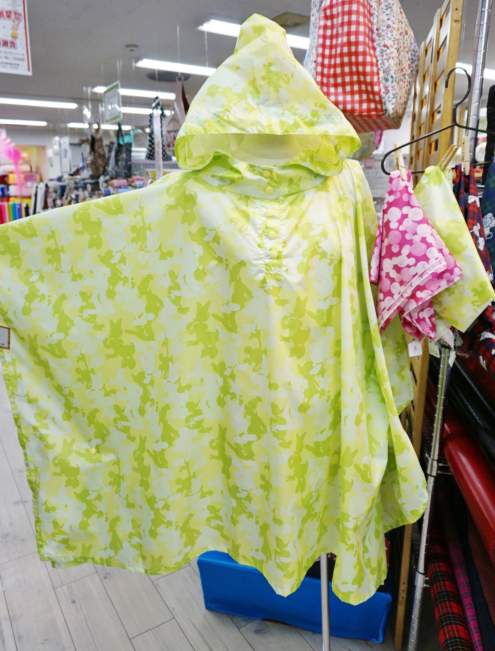 只今、売場ではレインコートの見本が展示中!撥水加工もされているので雨の日のお出かけやエコバッグ、レインコートにぴったりです。