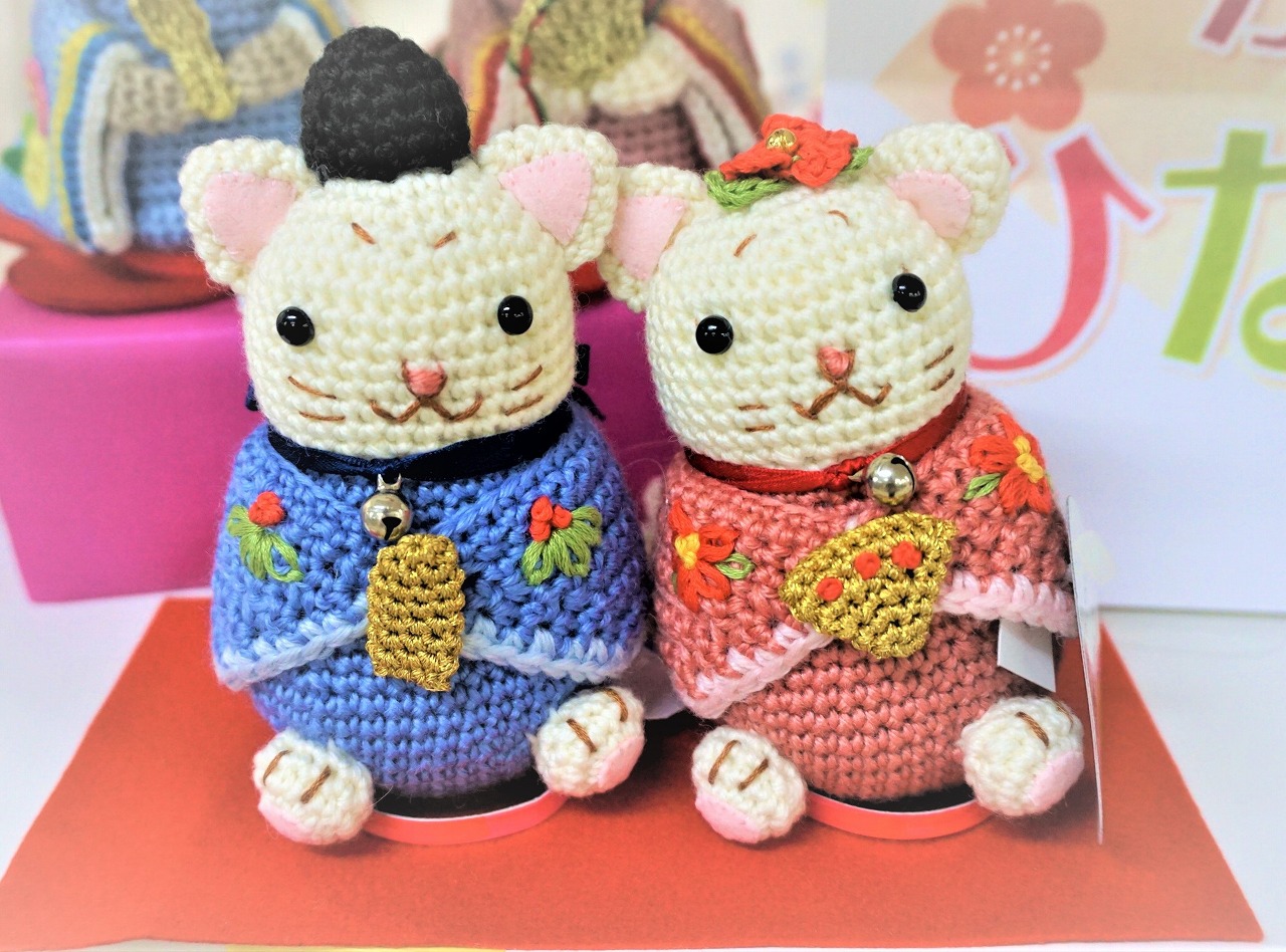 ねこのお雛様シリーズです。かぎ針を使用します。男雛・女雛ともに眉毛があり、首元に鈴、袂に模様があるので猫が好きな方におすすめです。
