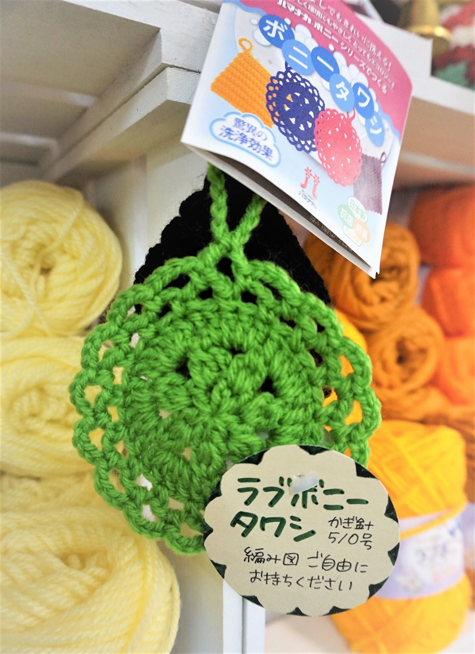 ハイバブルを使った見本になります。あんぱんたわしは平べったく、まーるい形をしているので使いやすい事間違いなし!ハイバブル毛糸1玉で約5個作ることができます。見本では7/0で作ったもの、8/0で作ったものが展示されています。※詳しくはスタッフ迄。