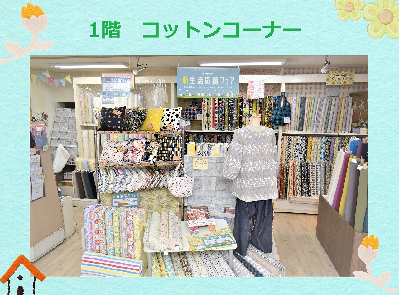 1階では「コットンコーナー」より、2階では「インテリアコーナー」よりおすすめアイテムがございます。