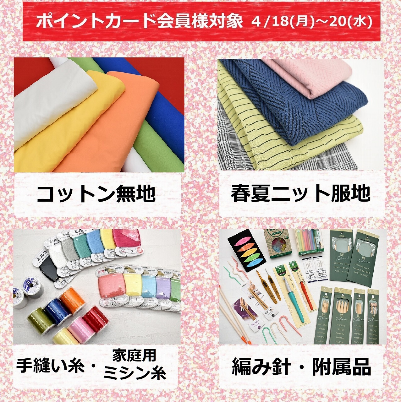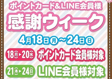 4/18(月)~24日(日)までの期間で、4/18(月)~20(水)迄カナリヤポイントカード会員様対象4/21(木)~24(日)迄LINE会員様対象イベントになります。