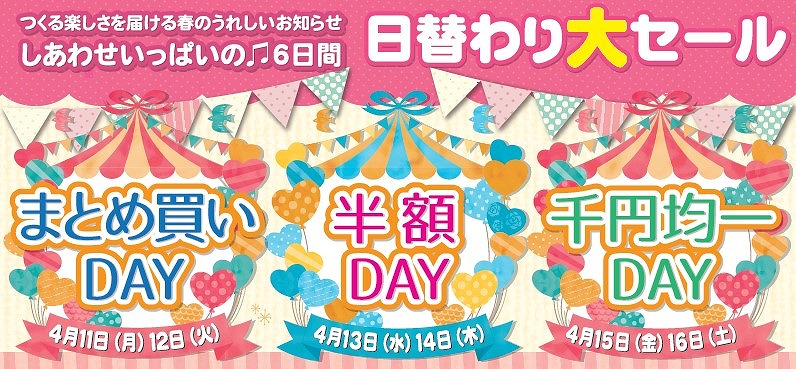 合わせまして、つくる楽しさを届ける春のうれしいお知らせ!しあわせいっぱいの6日間♪「日替わり大セール」を本店各階よりお買い得アイテムが日毎に変わるイベントを行います。