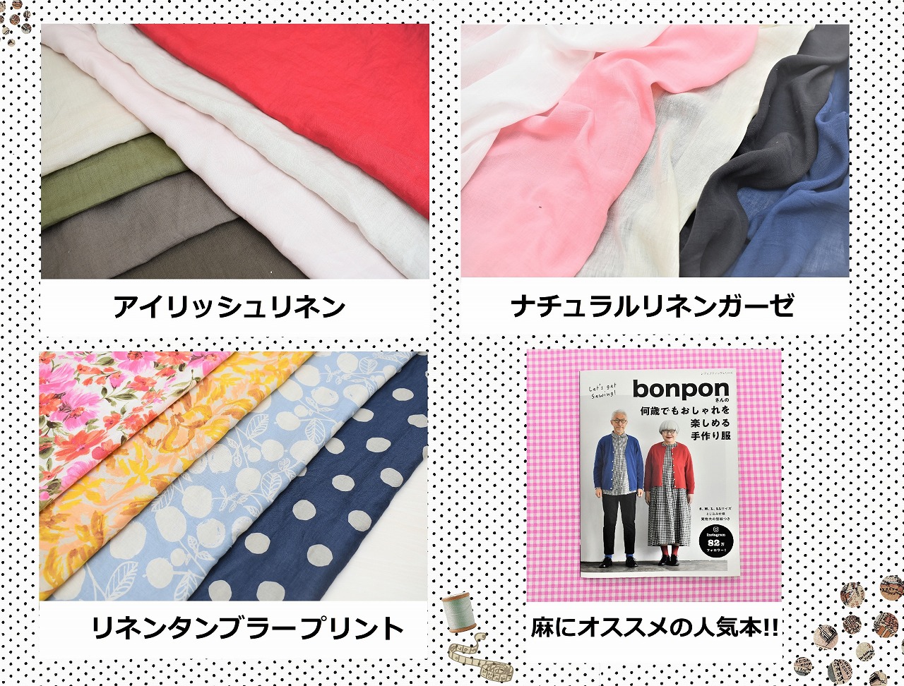 肌触りが良く、麻100%ですがチクチクしにくく、ブラウス・ワンピースなどの洋服作りに人気です。色数も豊富です。