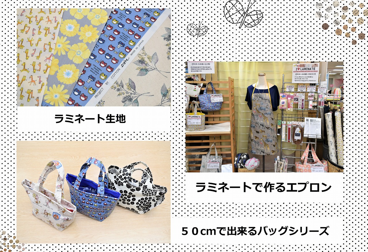 ラミネート生地とは、綿や綿麻生地の表面をシートで加工した生地になります。バッグを中心に人気ですが、今回はエプロンなどの作品見本を飾り提案をしています。
