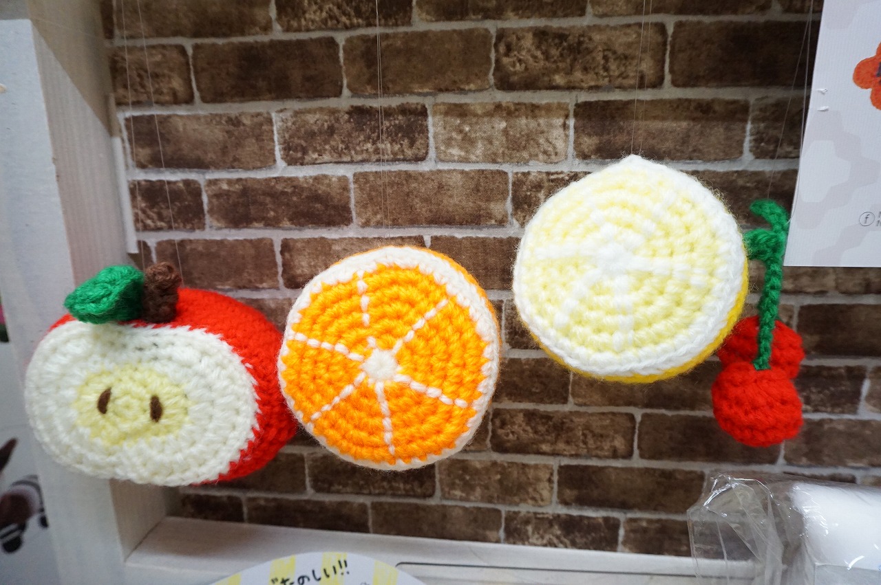フルーツ型のあみぐるみも展示中!各フルーツの輪切りに模したあみぐるみでお子さまとおままごとも楽しめますね♪
