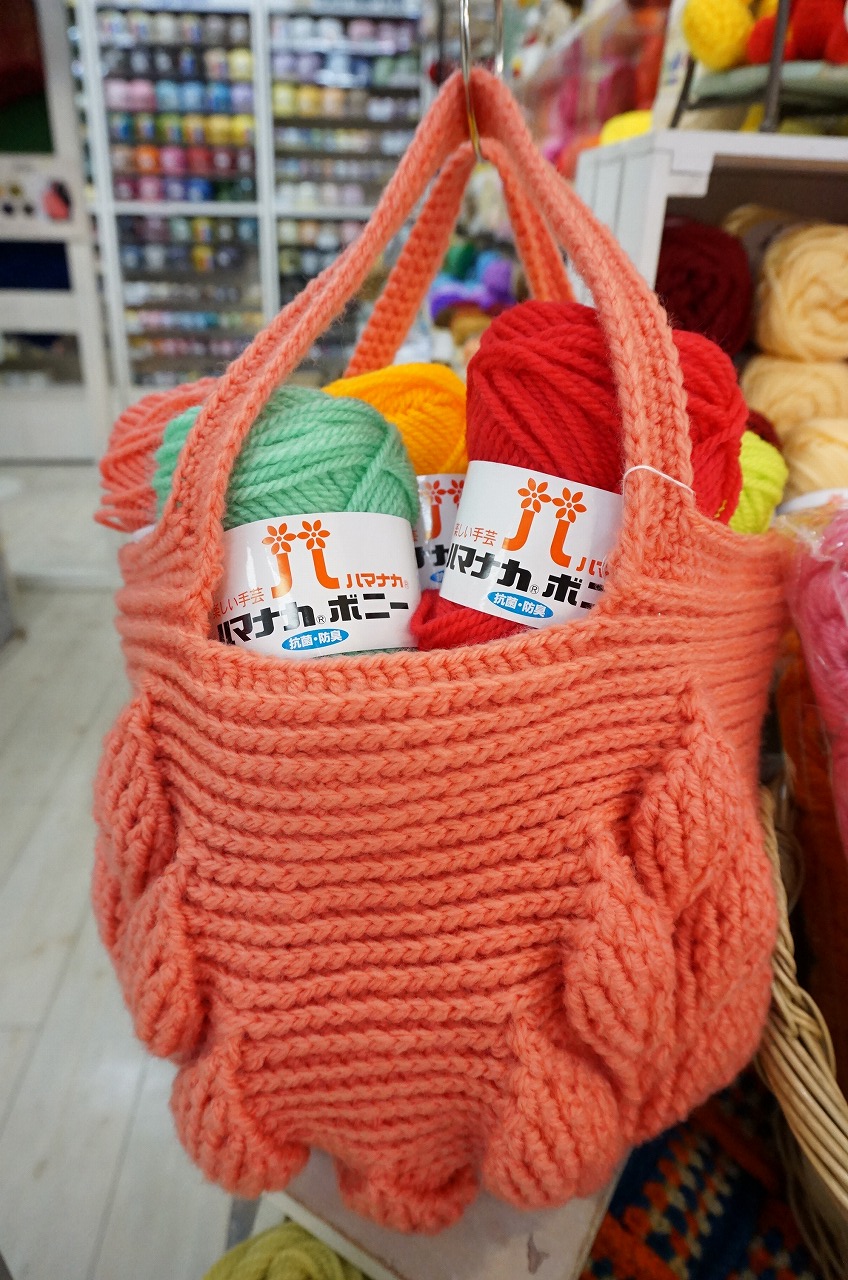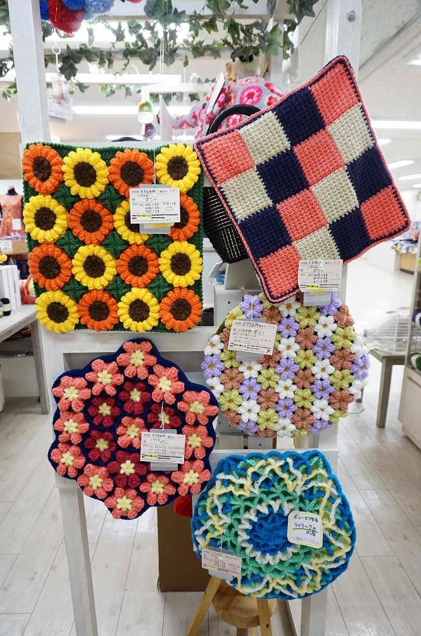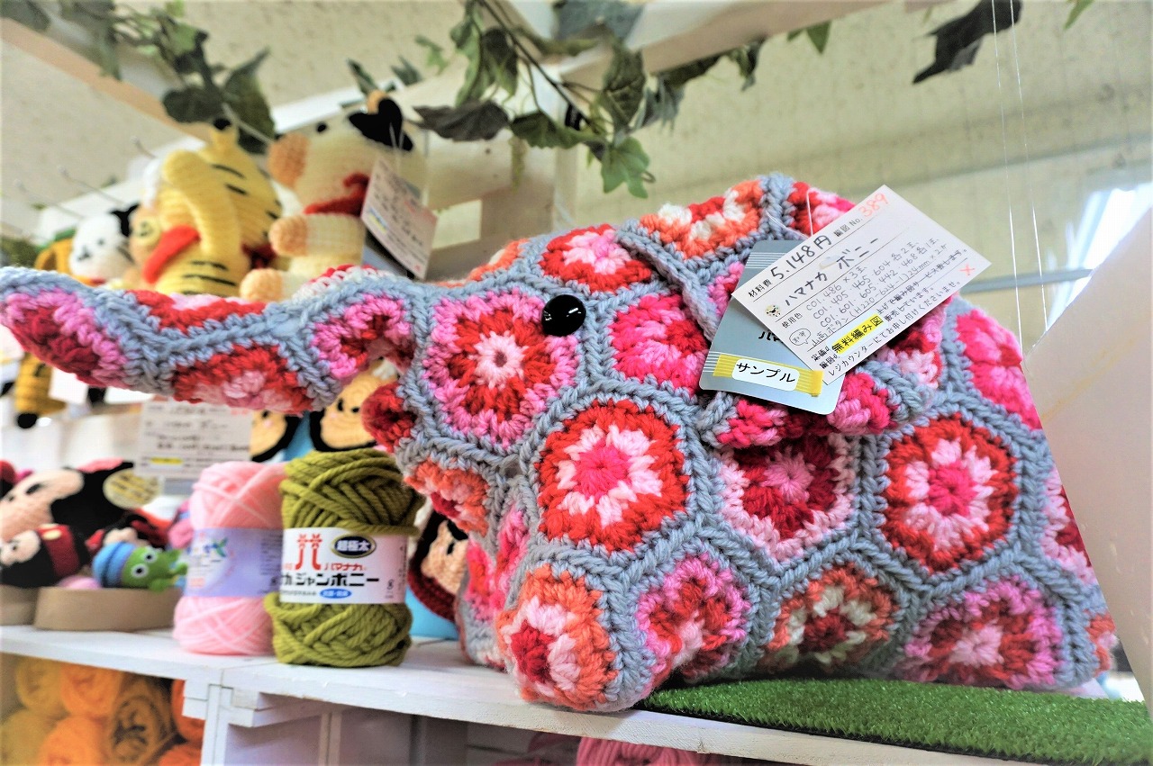 存在感バツグンなフラワーモチーフのゾウさんです!ここまで大きなあみぐるみは編むと根気が要りますがインテリアに彩を与えてくれそうです。無料編み図(No.389)もあるので編みたい方はレジまでお待ちしています!