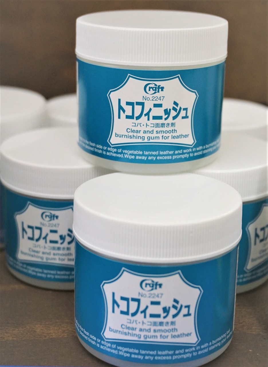 トコフィニッシュは革のコバ・床面の毛羽立ちを押さえ滑らかに仕上げ、綿棒などでコバにすり込み床面はガラス板やコバ磨き帆布を使って半乾きの状態で擦って磨き上げます。