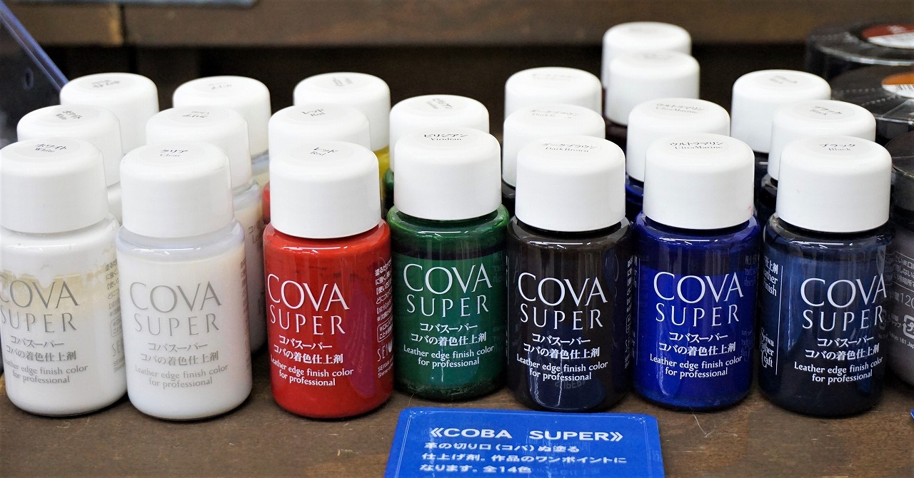 コバスーパーは、カラーも豊富で革の色と違う色を塗っておしゃれに作る事もできます。磨かなくてもいい用剤です。
