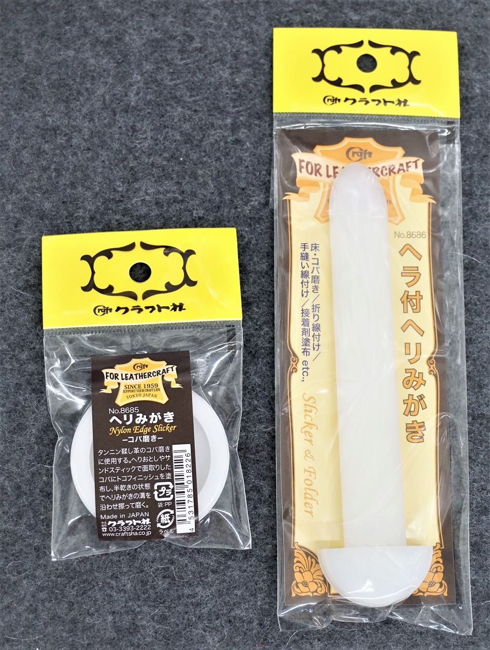 へら付ヘリみがきは、革の床面・コバ磨きに使用したり、折り線付け、縫い線付けにも活躍できます。