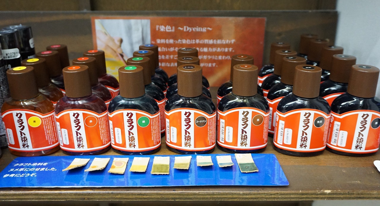 革用染料は、塩基性染料でタンニン鞣し革に特に染着しやすく透明感のある色合いで混色や重ね塗りができ、薄める時は水を使用します。乾燥後にレザーコートを塗り色止めします。