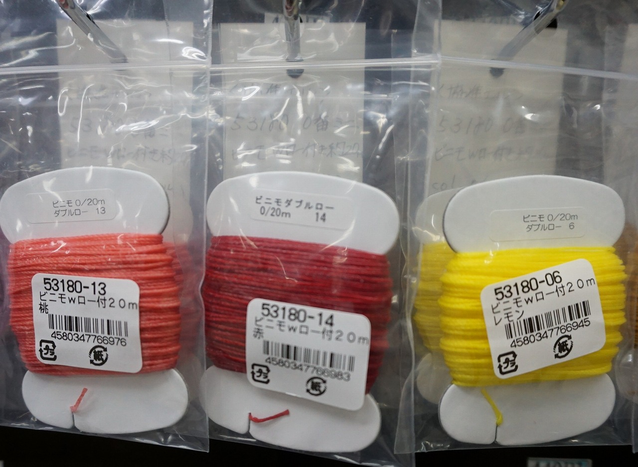 ビニモダブルロウ付き糸 ポリエステル素材にロウがついている摩擦に強い糸で糸のはしを焼き止めできます。