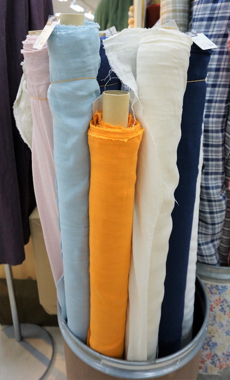 リネンは春から夏にかけて特に人気でございます。リネン生地は衣料生地の中でも人気ですが、他にもキッチンまわりのアイテムを作る時にもおすすめでございます。お洗濯すればするほど強度が増すのに対し、使うほどに柔らかくもなるので1枚あると本当に便利です。