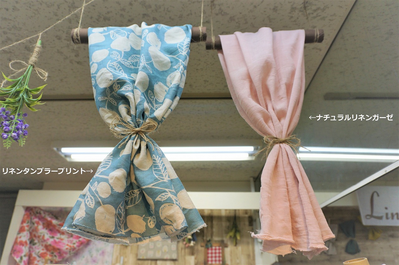 右側が「ナチュラルリネンガーゼ」、左側が「リネンタンブラープリント」を使用しています。リネン生地はインテリアにも長くお使い頂けるのでお気に入りカラーや柄を選ばれるのもおすすめです!