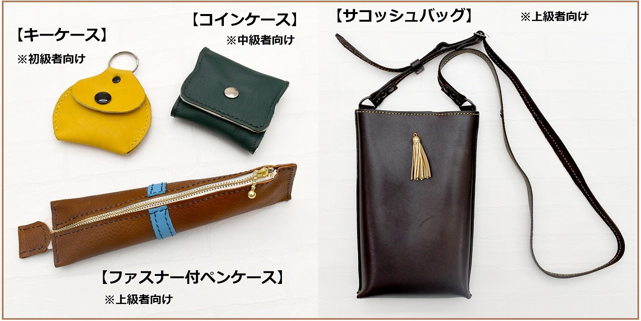 キーケースは「初心者向け」・コインケースは「中級者向け」・ファスナー付ペンケース、サコッシュバッグは「上級者向け」になります。