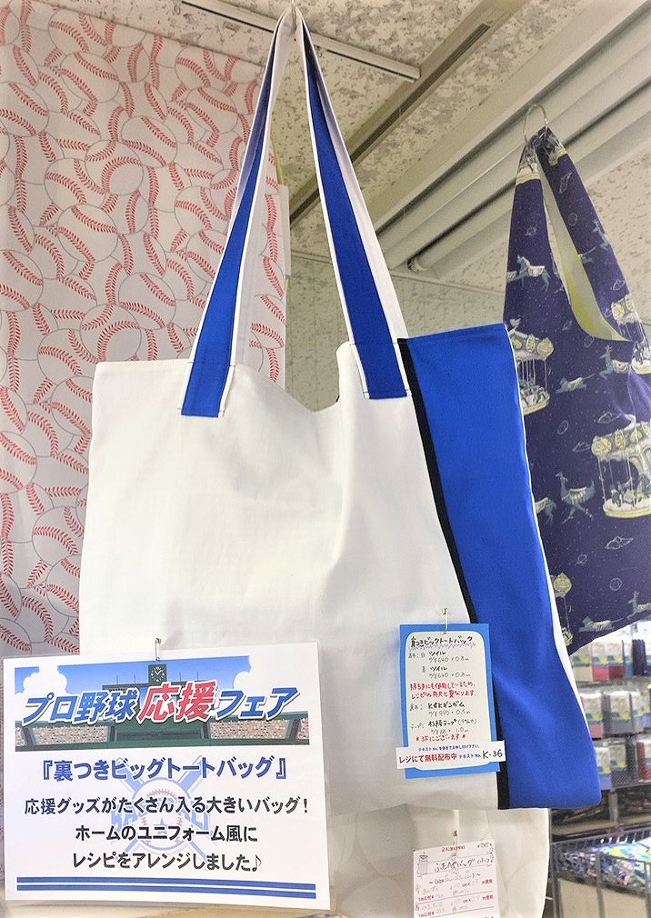裏つきビッグトートバッグの見本です。白×青カラーが爽やかで推し球団カラーを再現しています。応援グッズをたくさん入れることが出来る大き目のトートバッグは作ると重宝します!