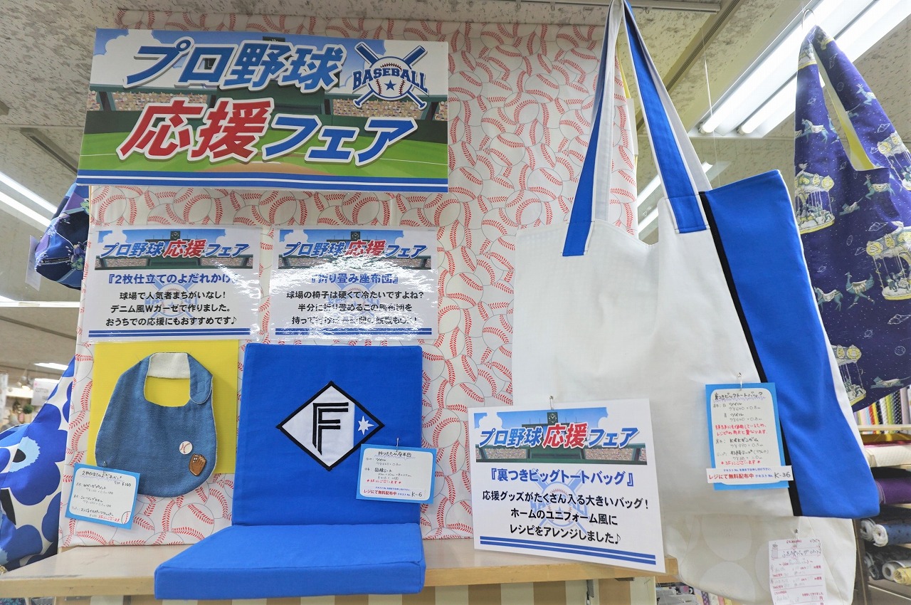 フェアにもある野球応援向けのコーナーでは「スタイ」・「折りたたみ座布団」・「バッグ」が展示されておりますが、どれも応援の時に持ち歩きたくなるものばかりです。