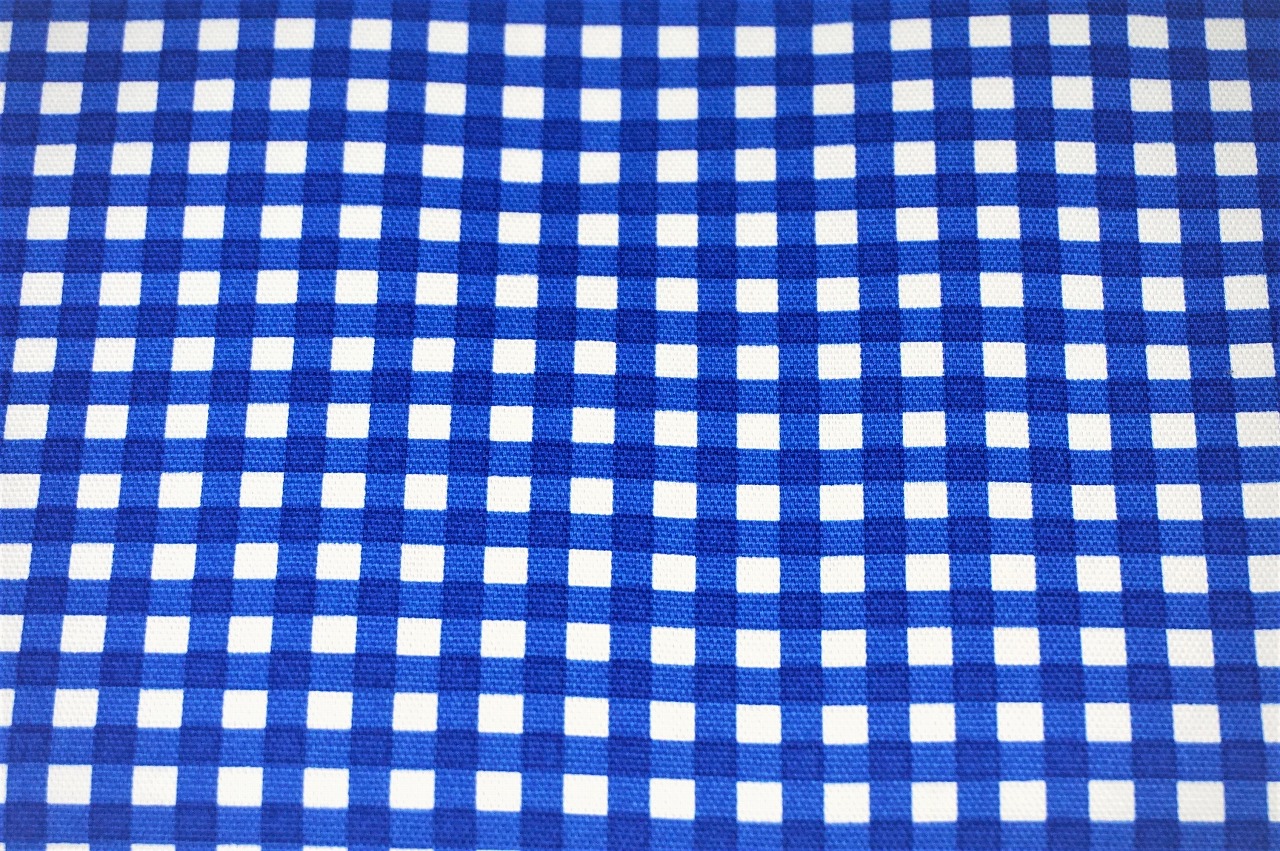 ギンガムチェックの生地です。綿素材なのであらゆるアイテム作りや裏地にお使い頂きやすいです。ギンガムチェックがはっきり描かれています。トートバッグには青系のギンガムを使用しています。