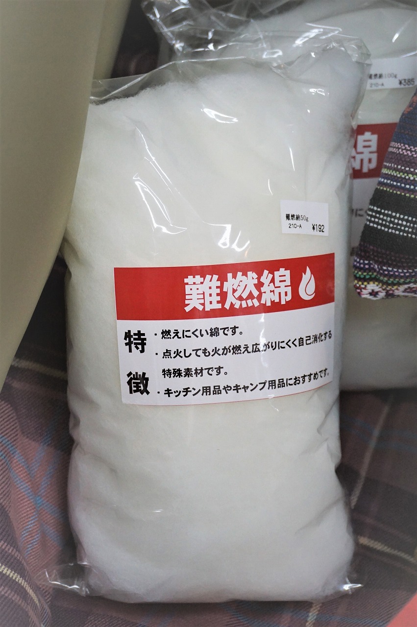 難燃綿とは・・・燃えにくい綿。点火しても燃え広がりにくく自己消化してくれる特殊素材をしています。キッチン用品・アウトドア用品作りに役立ちます!