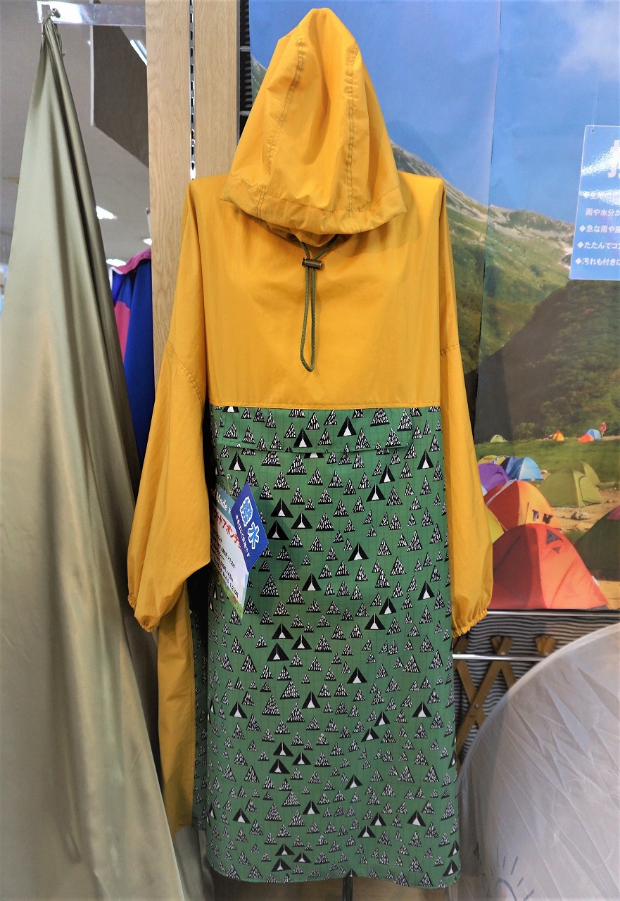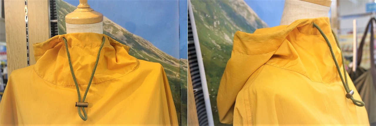 雨の時に大活躍のアウトドア向けアウターです。こちらはドラ●もんもびっくりの大きなポケットが前についていまして、見た目よりも収納力があります。お好きな柄のナイロンと無地ナイロンを合わせるとおしゃれ♪また、ポンチョはかぶるだけで着用でき、不要な時は折りたたむことができます。リュック等荷物がある状態でもそのまま上から着用できるのもポンチョの魅力です!