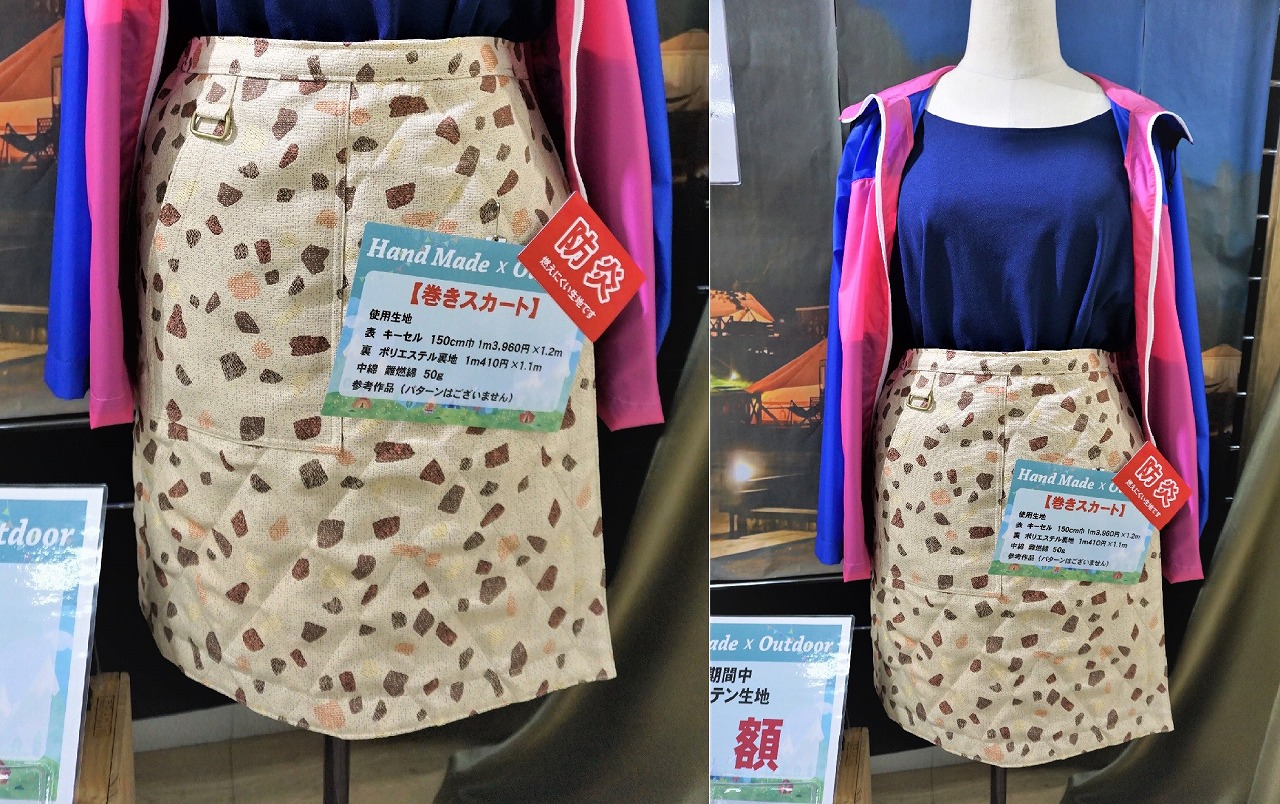 アウトドアではキャンプで薪を割り火を使う場面があると思いますが、防炎生地があれば安全です。見本では巻きスカートや鍋つかみ、キャンプマットが防炎生地を使用しています。触れてみますととても頑丈でしっかりした作りです。