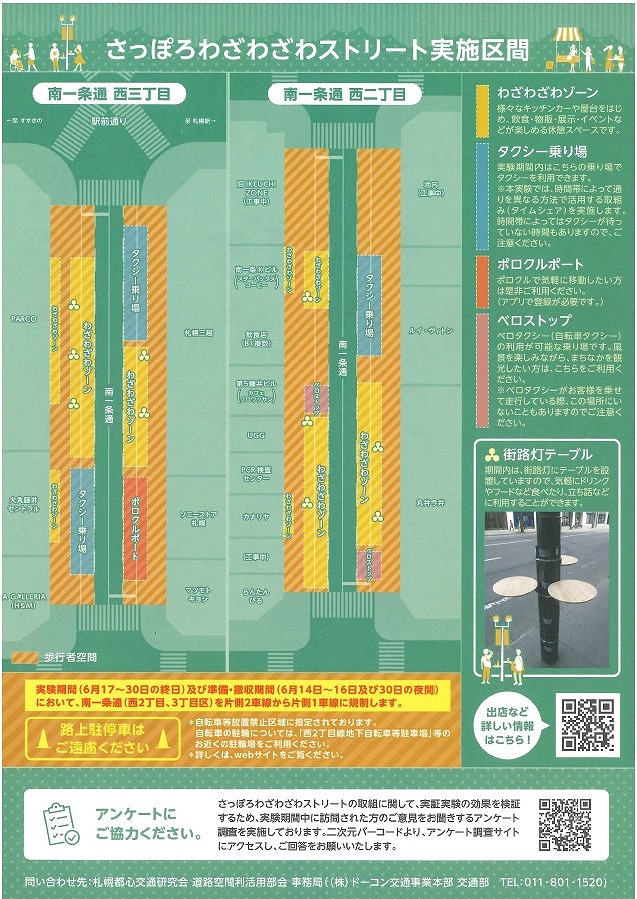 「まちに新たな賑わいをもたらすこと」・「歩行者が安心安全に過ごせる事」を目的に行う社会実験です。「みんなで わざわざ まちに出よう」をキーワードに、南一条通 西二丁目・西三丁目を舞台に新しいまちの使い方を模索する、というコンセプトのもと開催されます。