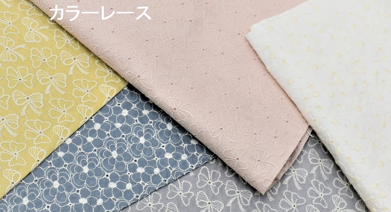 カラーものレースもリボン柄・花柄もおすすめ!刺しゅうは同じカラーのものやホワイトカラーで柄がわかるものまで揃っています。リボン刺しゅうはくすみパステルカラー、花柄は秋にも使える深みのあるカラーが印象的な綿レースはブラウスやスカートにおすすめです。夏らしいバッグやポーチ作りにも涼し気に決まります。