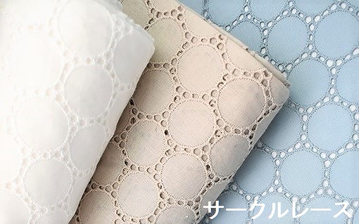 サークルレースは切りっぱなしの状態でもほつれにくくそのままストールにしても◎こちらは透け感がとても涼しそうでサークルデザインが大きなドットのように見えるおしゃれな綿レースなので、ブラウスやチュニック等のトップスや、バッグやポーチ、巾着等の小物アイテム、クッションやテーブルクロス、カーテン等のインテリアアイテムにもおすすめです☆