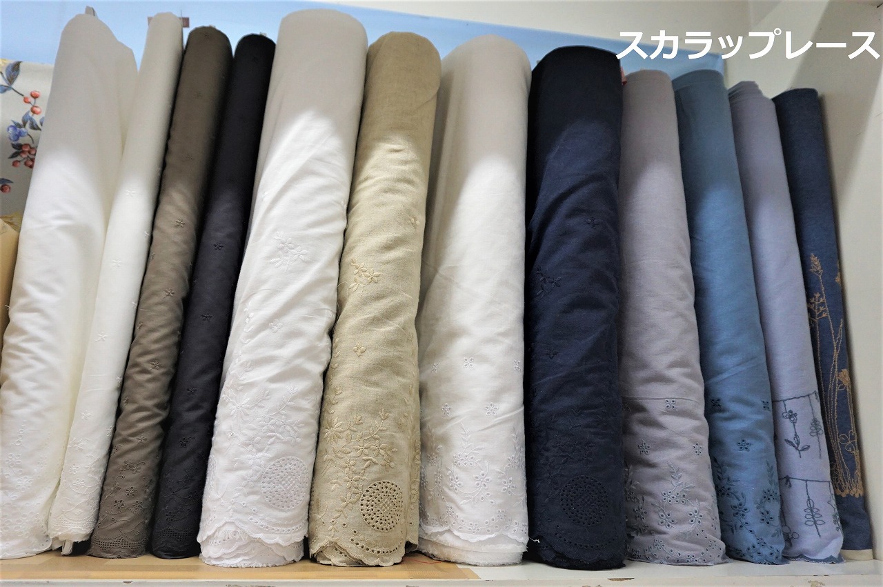 本店1階には刺しゅうが施されたおしゃれな綿レース生地が豊富です!