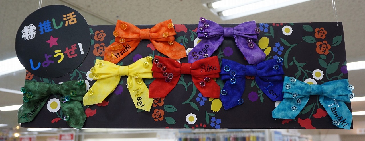 本店4階では推しグッズのデコレーションとして見本展示中!!オリジナルカットクロスでリボンを作って推しの名前をストーンで並べてみたり、うちわを縁取りや名前を入れる等、見本は自由に彩っています♪