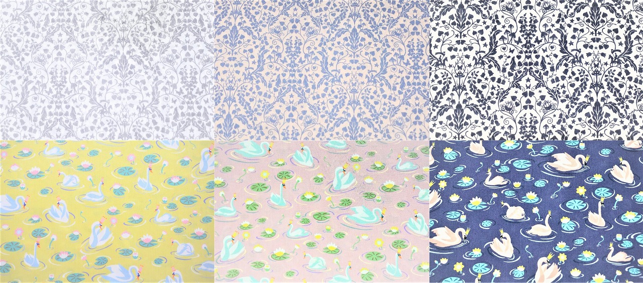 古くから童話に登場する堂々として優雅な白鳥、をテーマに描かれています。冠をかぶった白鳥たちが水面でスイスイ気持ちよさそうに佇んでいる姿がエレガントなオシャレな柄です。ブラウスやスカート、折りたたみバッグ作りなどにぴったりです。
