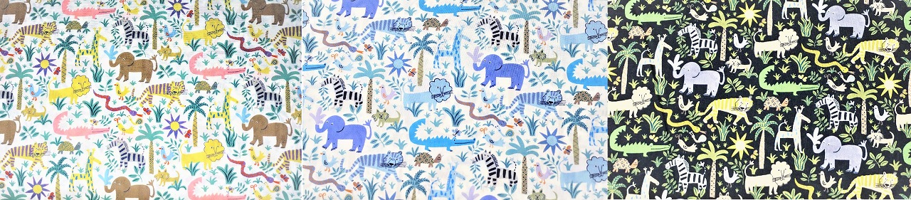 ライオン、ゾウ、キリン、シマウマ、トラ、ワニ、ヘビ、鳥等、動物や鳥が仲良く楽しそうなこのプリントはカラフルで可愛らしく、草や木なども手描きタッチでおとぎ話のジャングルに入り込んだ気持ちにさせます。衣類やポーチなどの小物作りにおすすめです。
